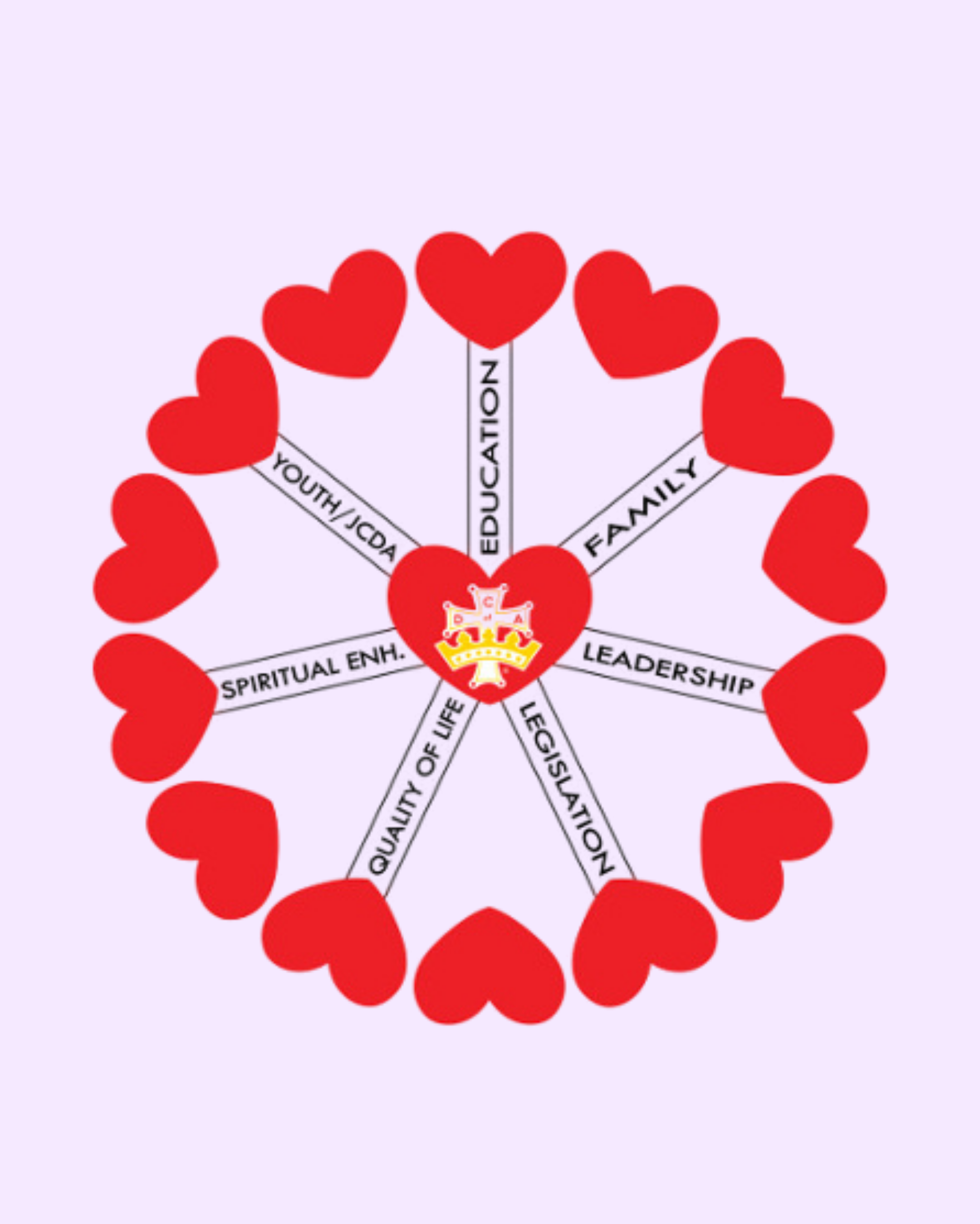 The Circle of Love is a symbol of the Catholic Daughters of the Americas and serves to guide the actions and hearts of each daughter and court across the Americas. The circle is comprised of seven spokes where Catholic Daughters are encouraged to direct their time, energy, and attention.